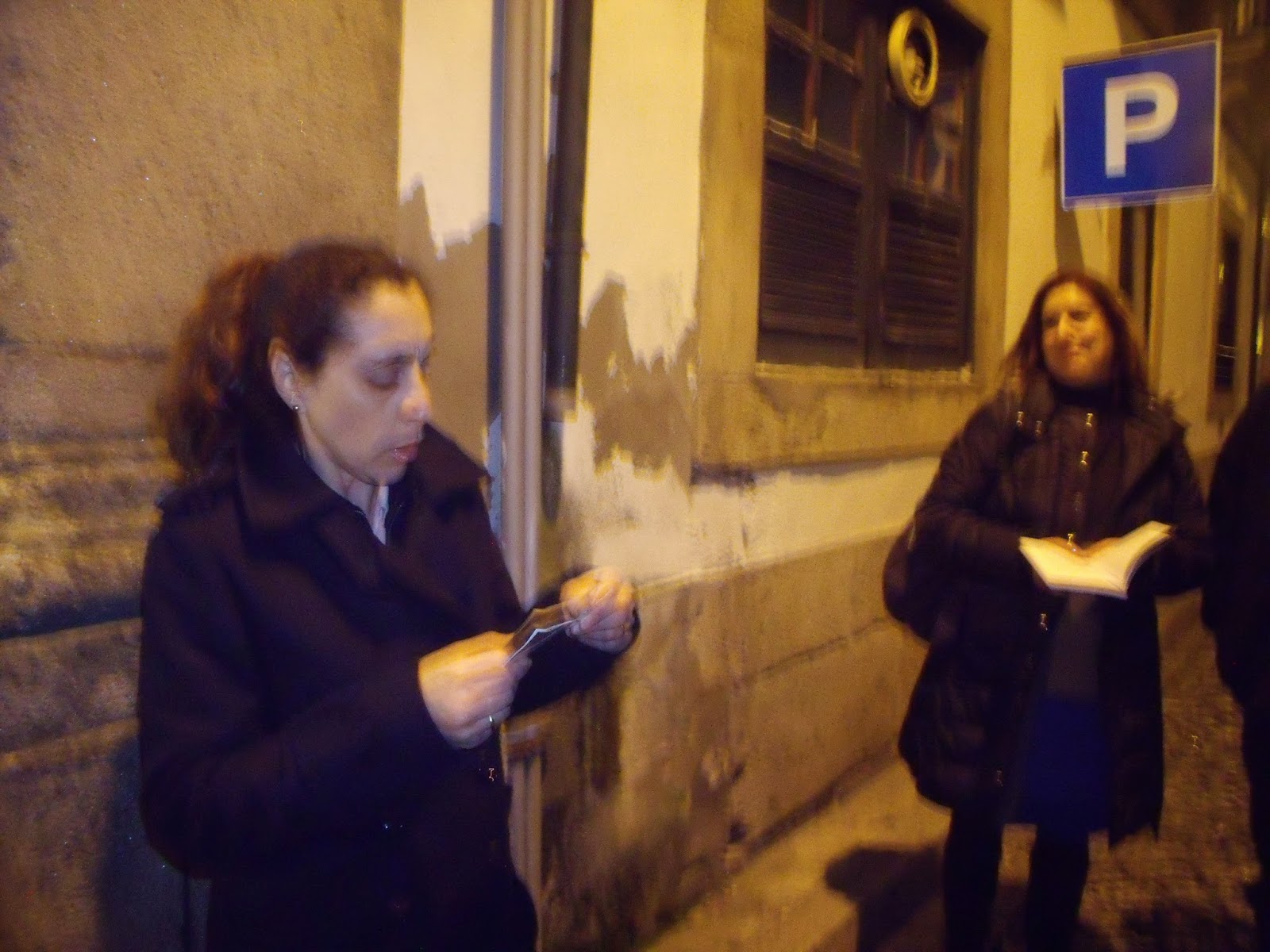O ponto de chegada foi na rua da casa dos Brocas, para realizar um pequeno momento de leitura em homenagem ao nosso escritor Camilo Castelo Branco. Juntamos-nos à esquina, sem concertina mas a ler textos interessantes e com muito humor. Também se lê a rir.